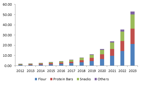3. Bug Based Flour: This application may observe 42% CAGR and surpass USD 165 million by 2023. They are primarily used in making biscuits, cookies, bread, muffin, desserts, soups, smoothies, and others.